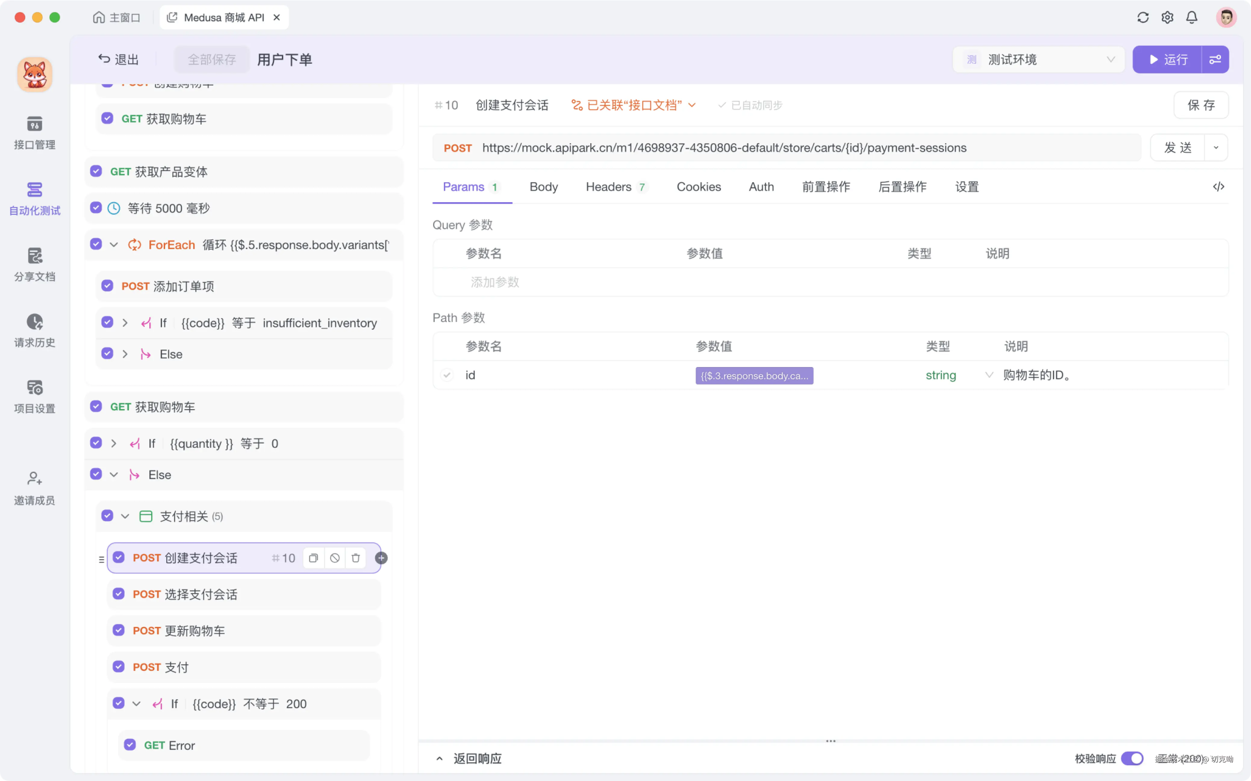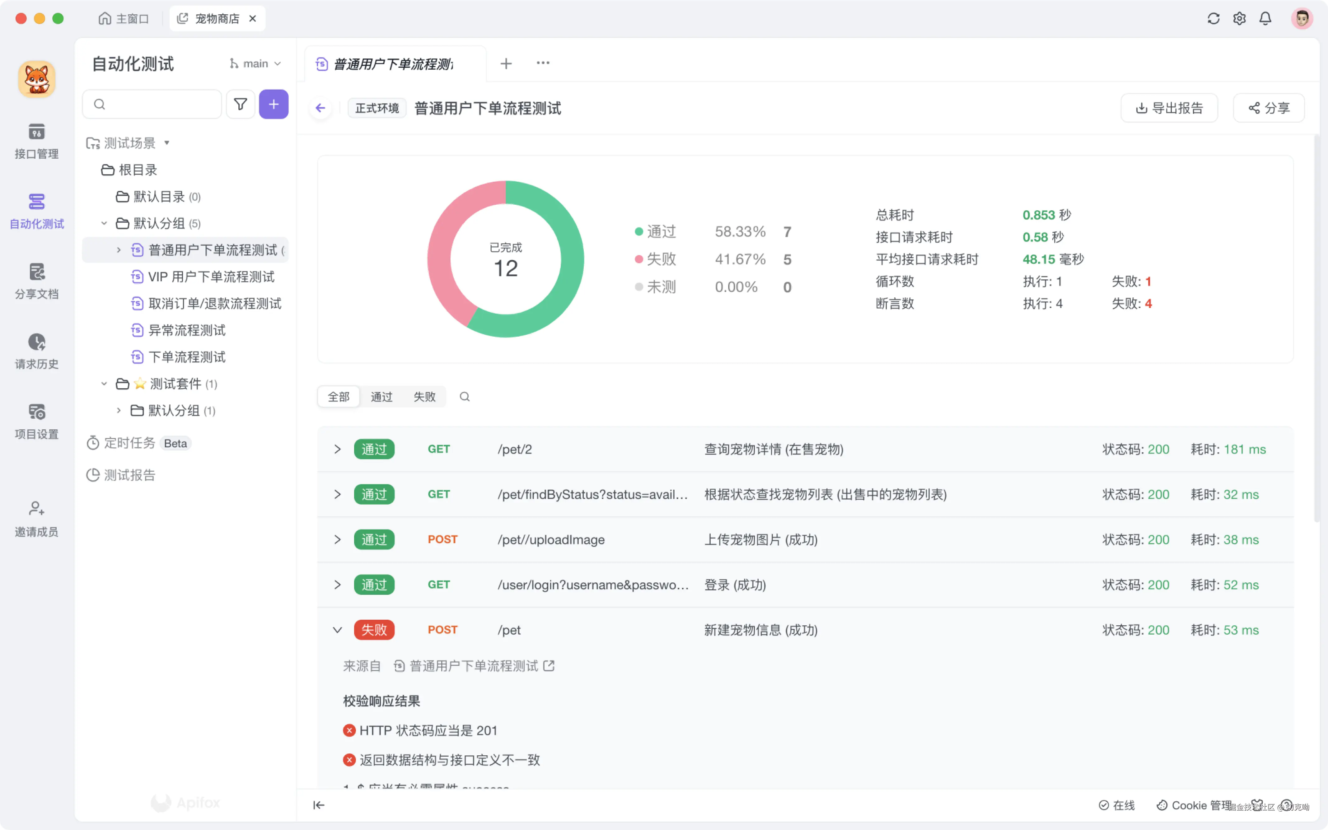 Apifox 在调试接口时就可以创建详细的测试用例,可以集成到自动化测试流程中,无需手写,非常方便。而且测试用例有任何变动,自动化测试内也会实时同步,对于团队协作非常友好。