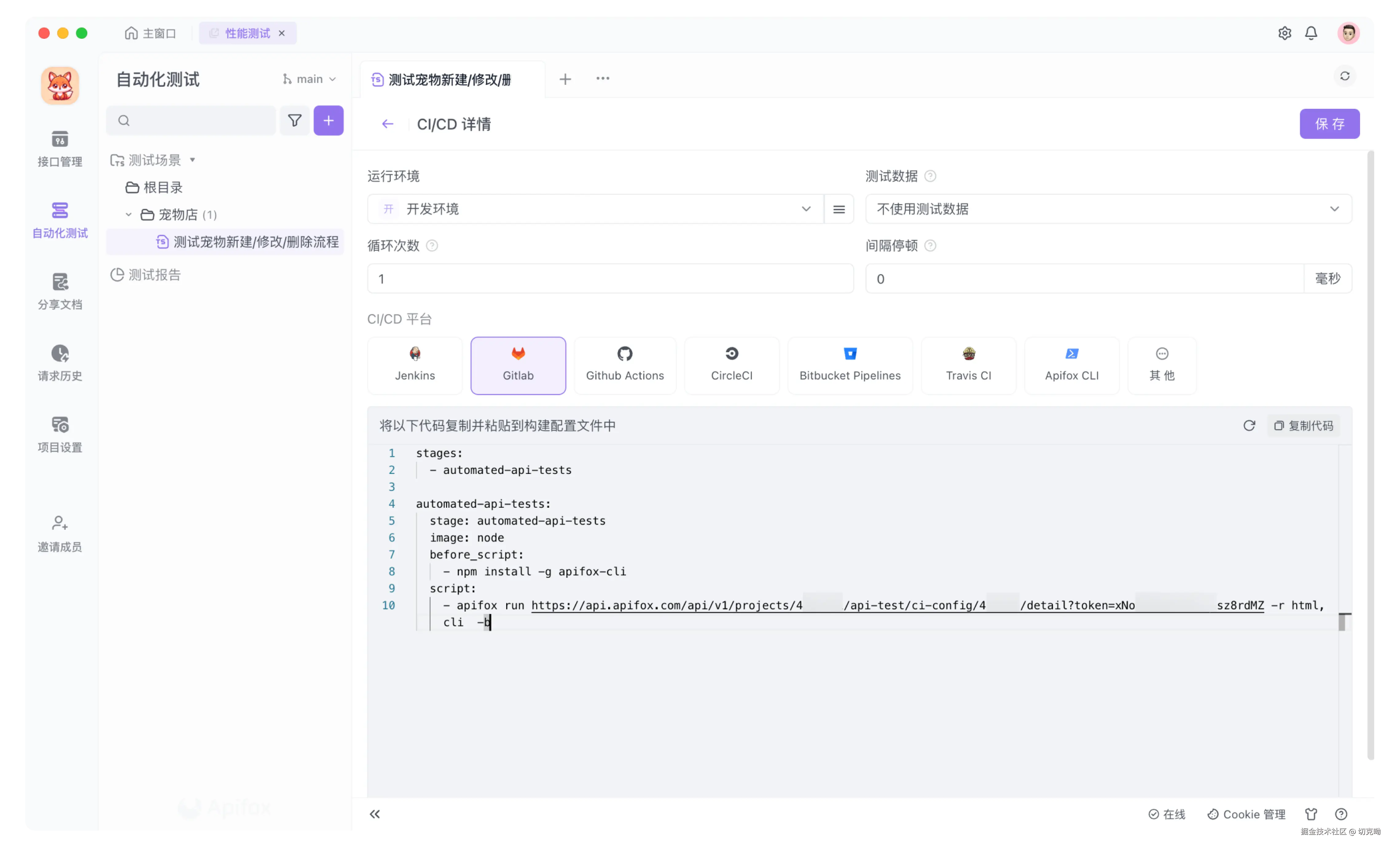 Apifox 支持与众多第三方平台集成,比如 Jenkins、Gitlab 等。通过 Apifox CLI 来运行测试场景,轻松与各种 CI 工具集成,无成本嵌入现有的公司 DevOps 工作流,让每次版本发布更自动、更有保障。