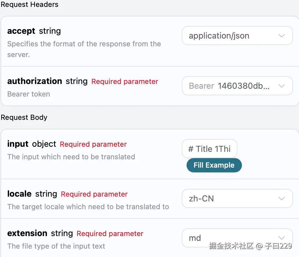 accept:指定接收 JSON 格式的响应结果,这里填写为application/json。authorization:调用 API 的密钥,申请之后可以直接下拉选择。