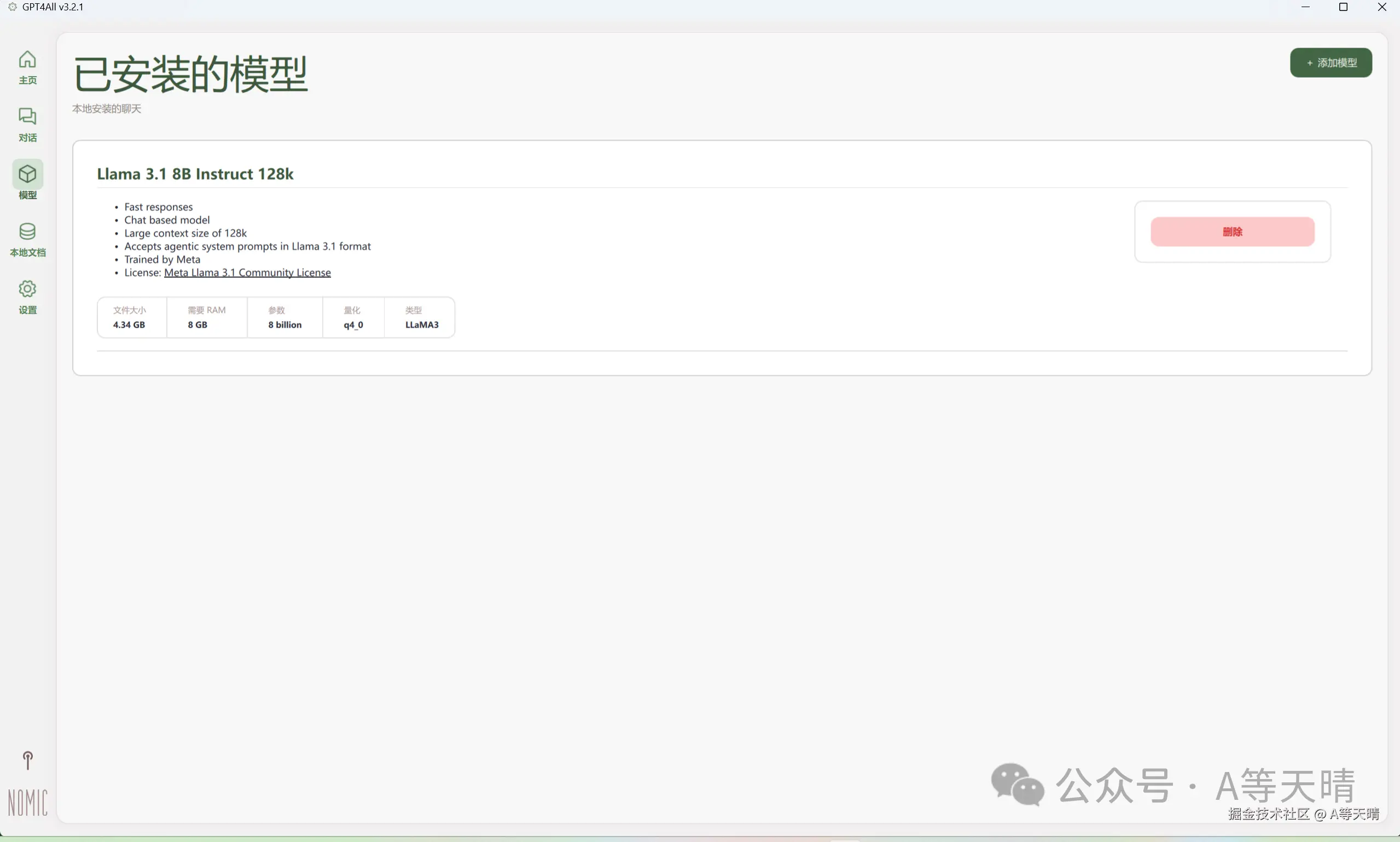 下载好之后就可以选择对应的模型进行对话了,然后在这个可视化的界面里面也是可以自己进行删除模型的