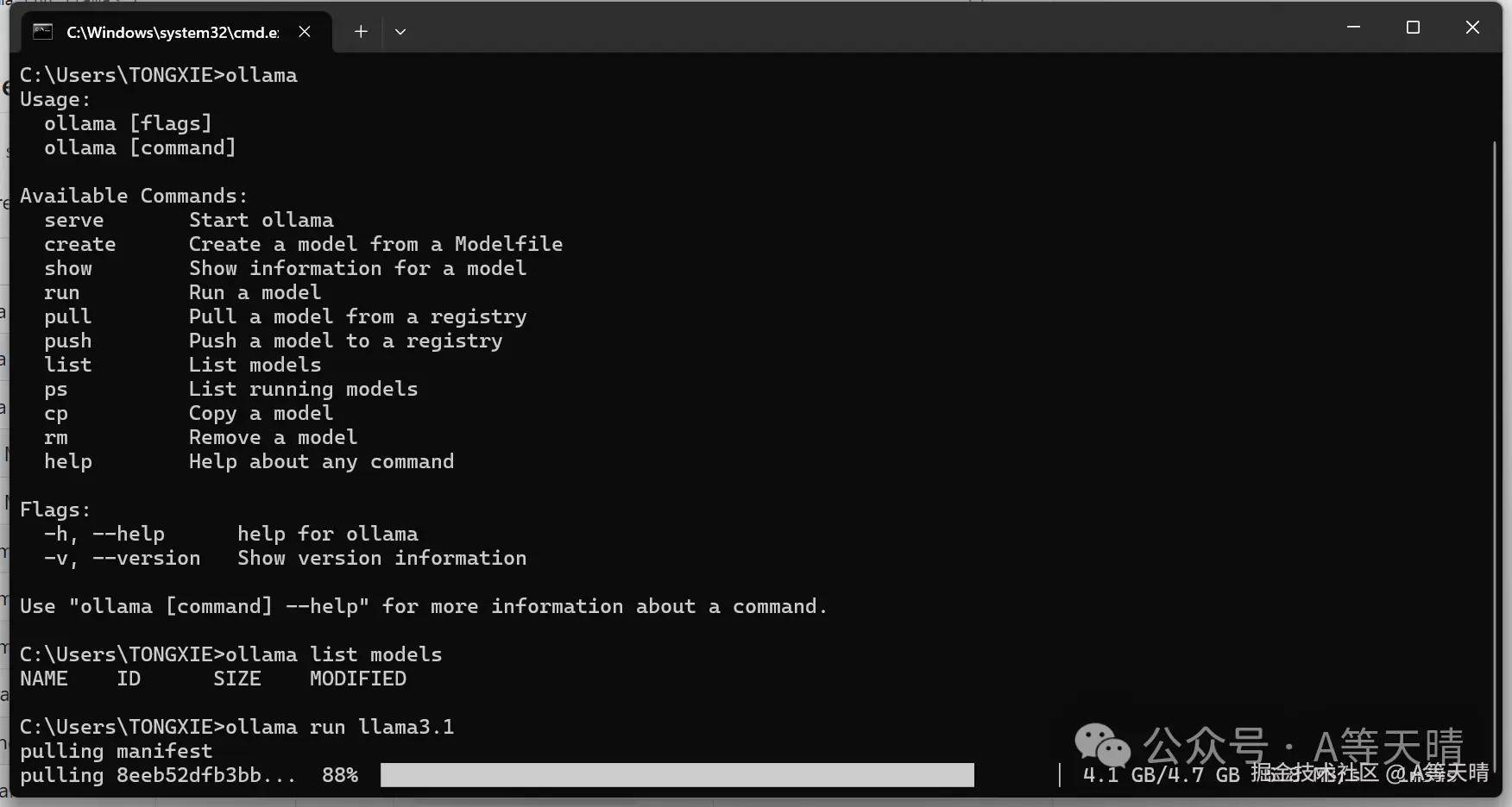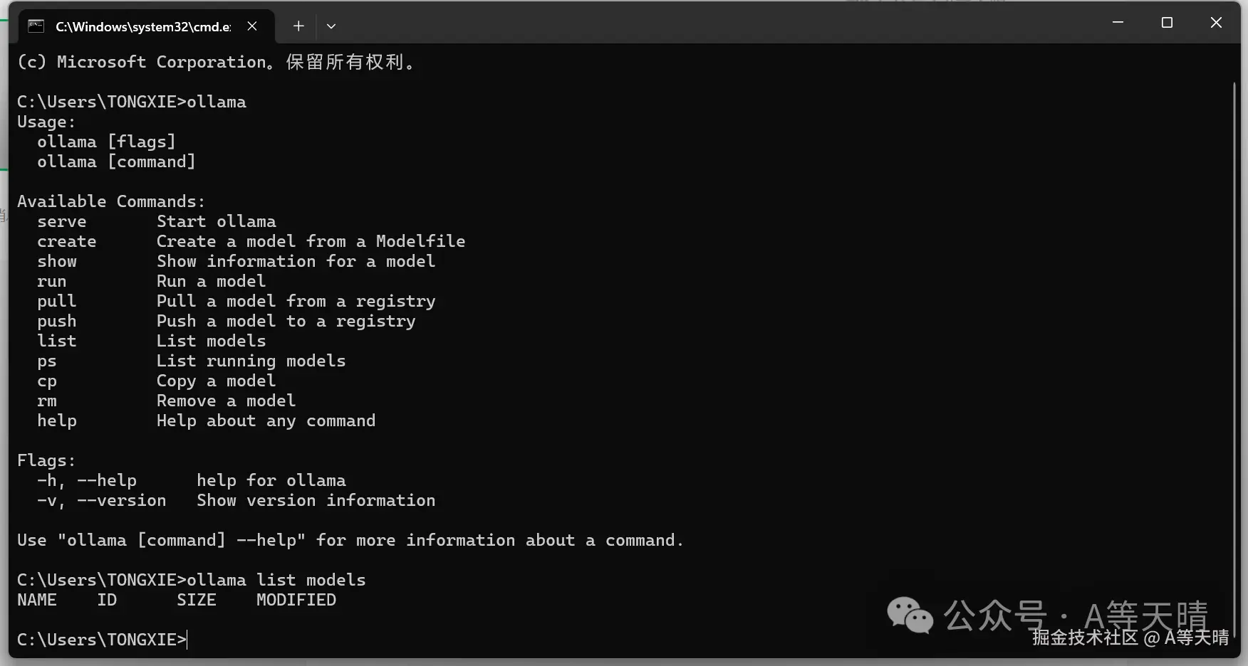 安装好后可以在win加r输入cmd调出命令行窗口输入ollama进行查看ollama是否安装成功,如果安装成功则会跳出以下界面,但是这时候还没有下载大模型,所以还不能直接使用