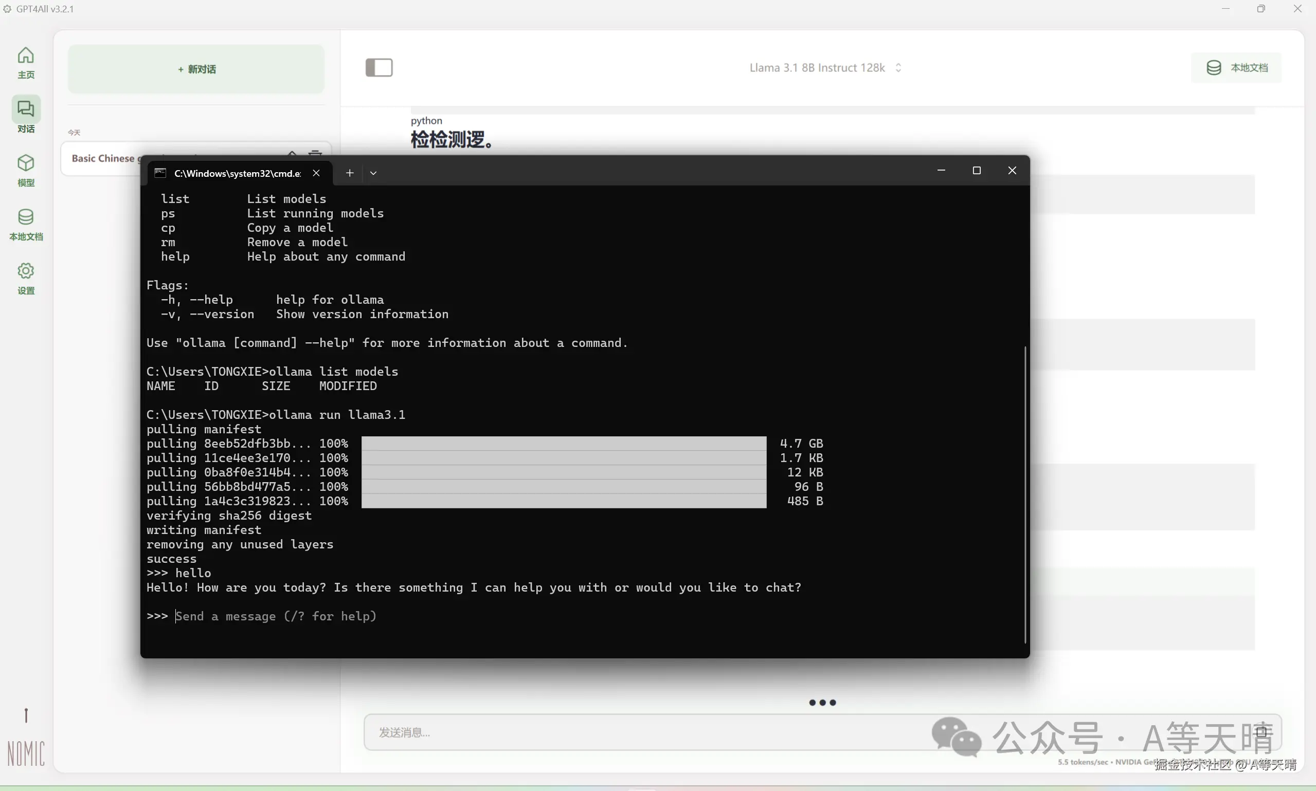 下载成功后就可以直接在命令行窗口进行对话,但是这里只是在命令行窗口进行回答,但是这里有一个温馨提醒,一定要根据自己的电脑配置进行下载对应的模型,因为我现在这个电脑是笔记本的4070配置运行起来都会有电脑死机片刻的情况,可能是我在做这篇博客的时候,后台的可视化ui界面也在运行着一个大模型,使得运行两个大模型,让我的电脑卡死。