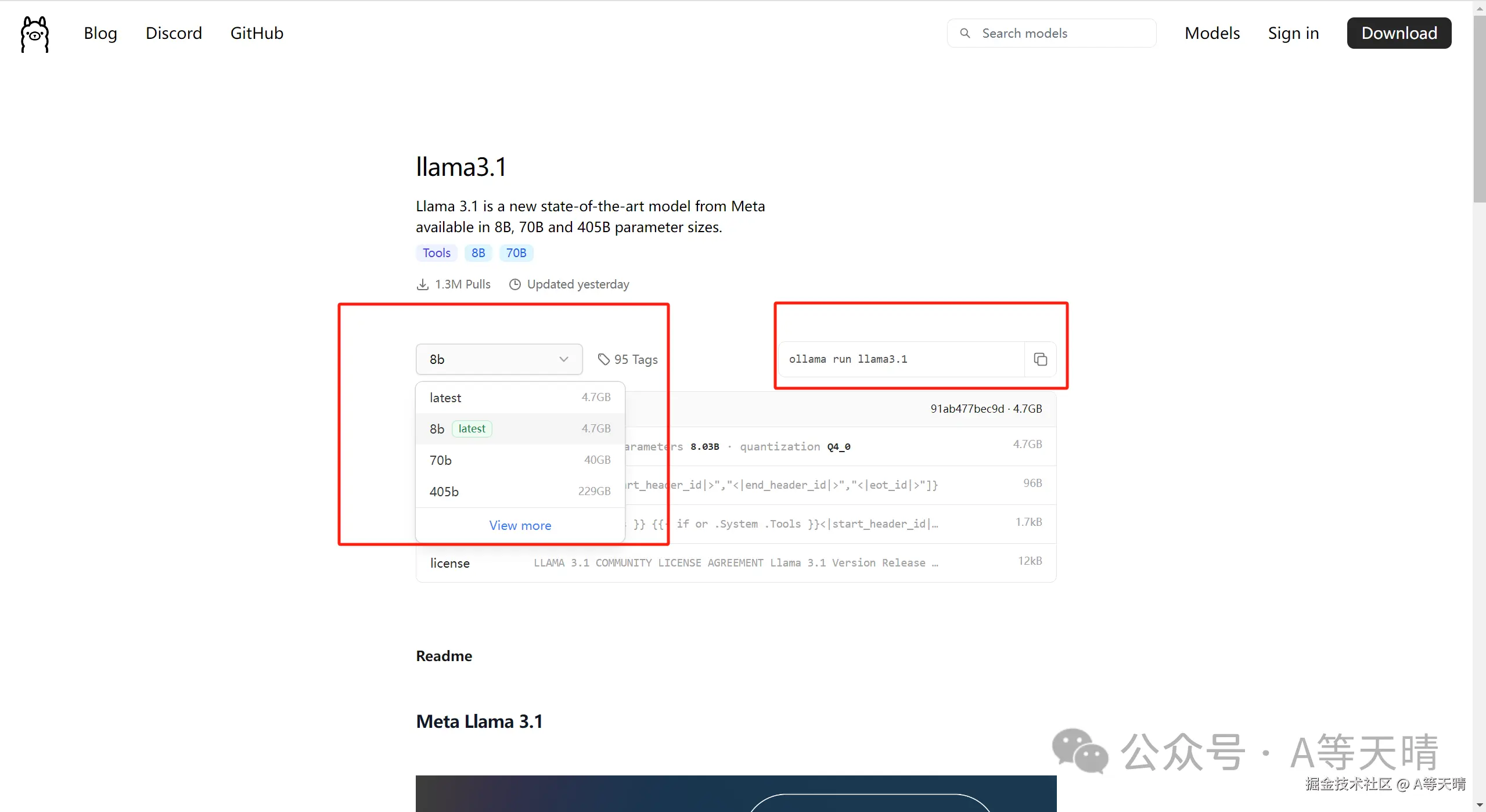 点击后就可以筛选大模型,然后每个大模型其实会有不同的版本,对应需要的空间也不同,大家可以自行根据自己的电脑配置进行选择,然后右边就是它的下载代码,只需要把它粘贴到刚才的命令行窗口即可。
