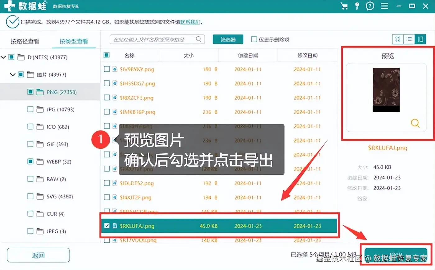 步骤3:扫描结束后,软件会展示所有找到的照片。用户可以预览照片,并选择需要恢复的文件。最后,点击 【导出】 ,并在弹出的窗口中选择一个新的位置来保存这些照片。