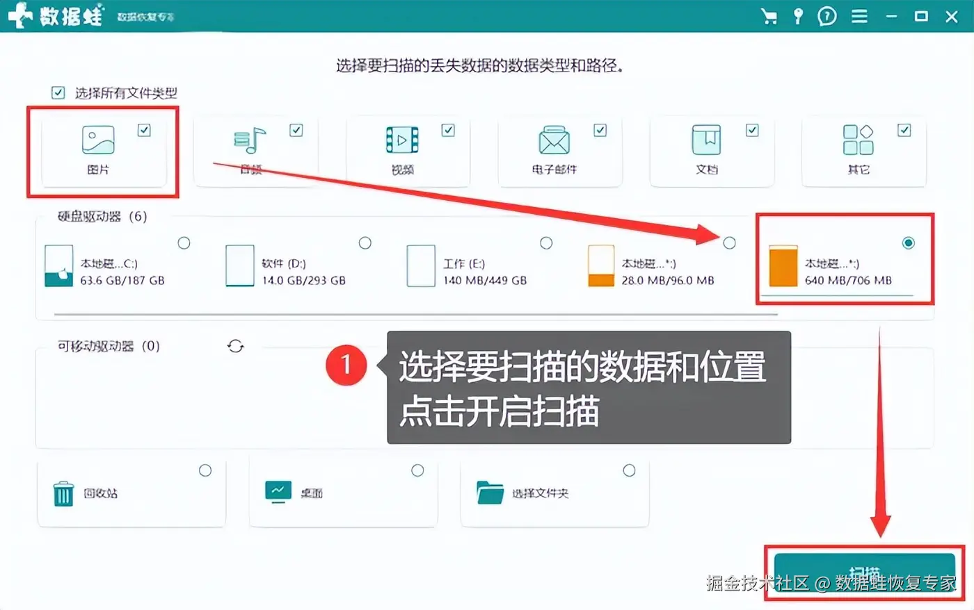 步骤2:接下来,软件会显示计算机上所有可用的存储设备,我们需要选择包含丢失照片的磁盘或分区。然后点击扫描。