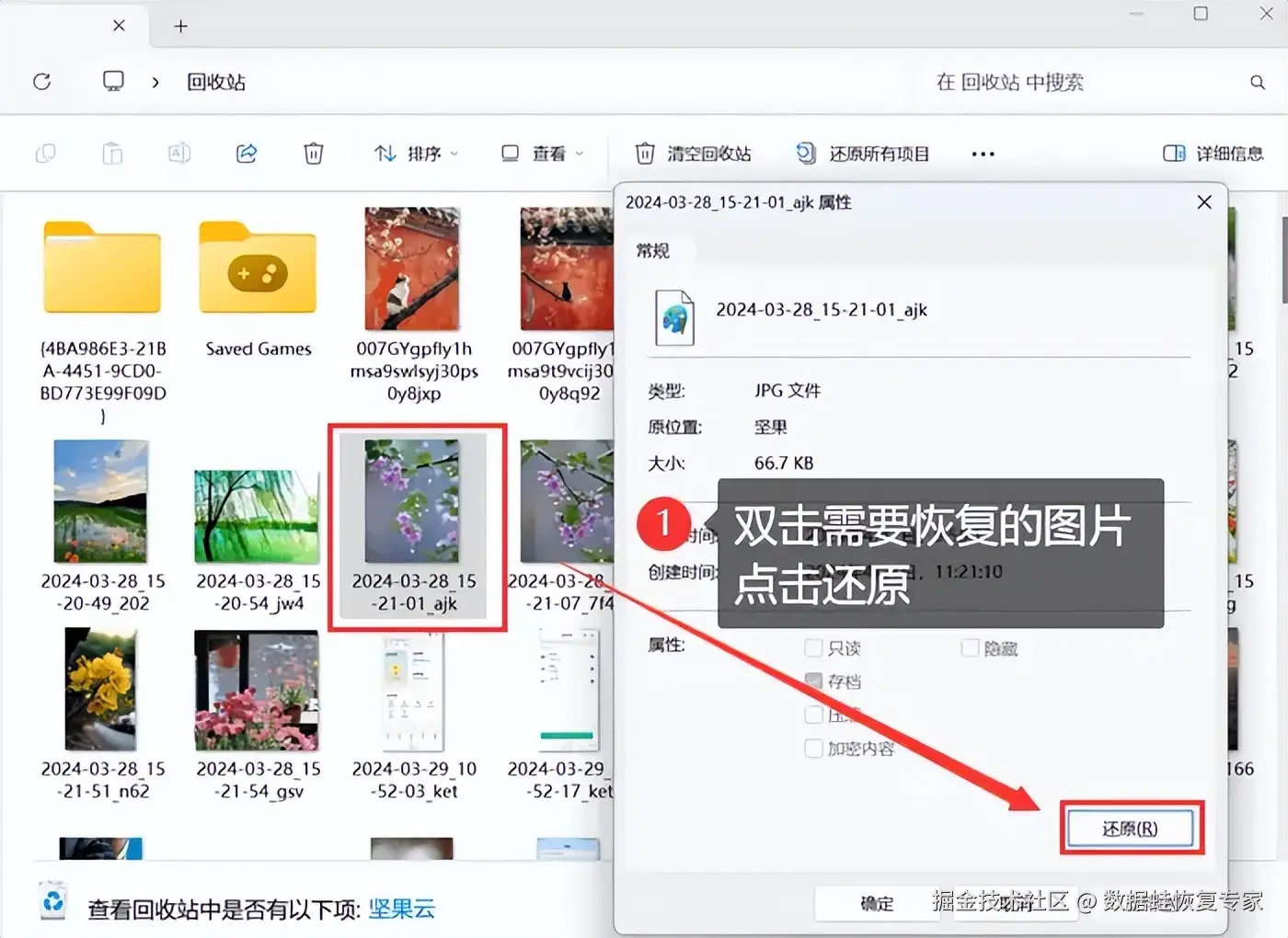步骤2:找到你误删的照片,右键点击并选择 【还原】 ,照片就会被恢复到原来的位置。