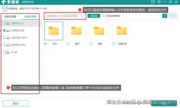 步骤3: 扫描完成后,用户可以通过页面左边的栏目,通过【按路径查看】或【按类型查看】两个方式去查找、勾选需要恢复的文件。也可以选择直接在搜索框上输入文件名称或保存路径,查找目标文件。