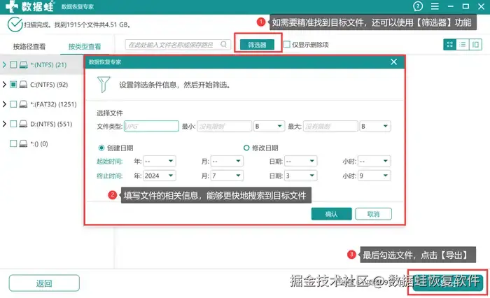 步骤4: 如果想要更加精准地找到目标文件,也可以试试【筛选器】功能。点击搜索框隔壁的【筛选器】,输入文件类型和文件创建时期等文件相关的信息,最后点击确认,软件会尽力找到你所需要恢复的目标文件。