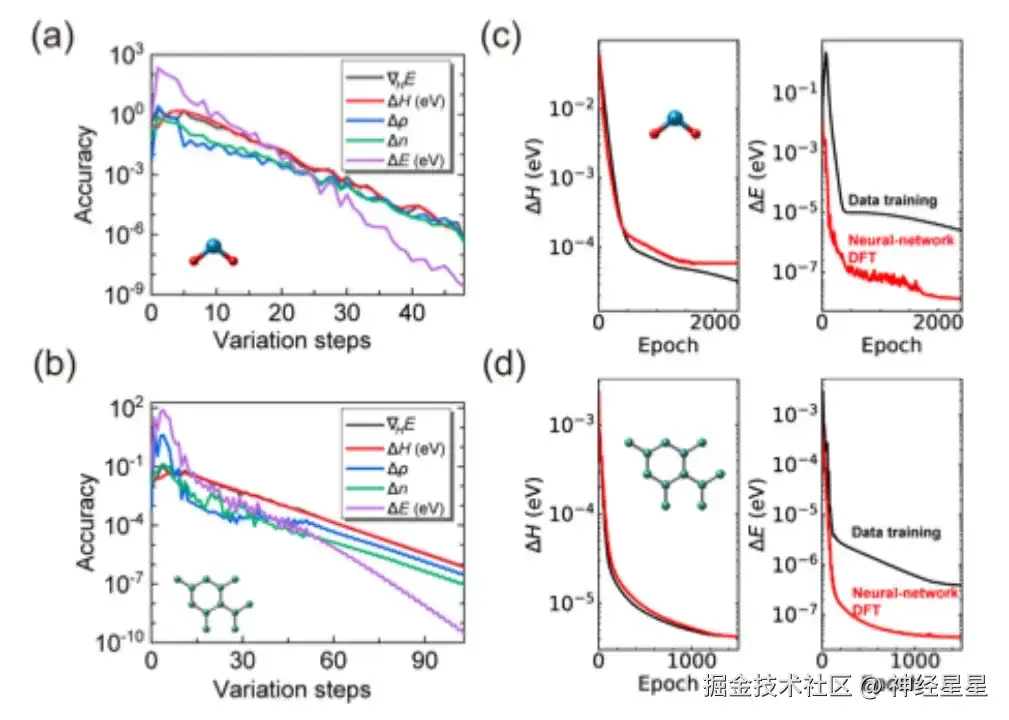 另外,在能量的预测精度 (prediction accuracy) 方面,神经网络 DFT 的性能显著优于数据训练。例如,对于 H2O 分子,神经网络 DFT 的能量预测精度达到 0.013 μeV,比数据训练的 0.83 μeV 高出 60 倍以上。