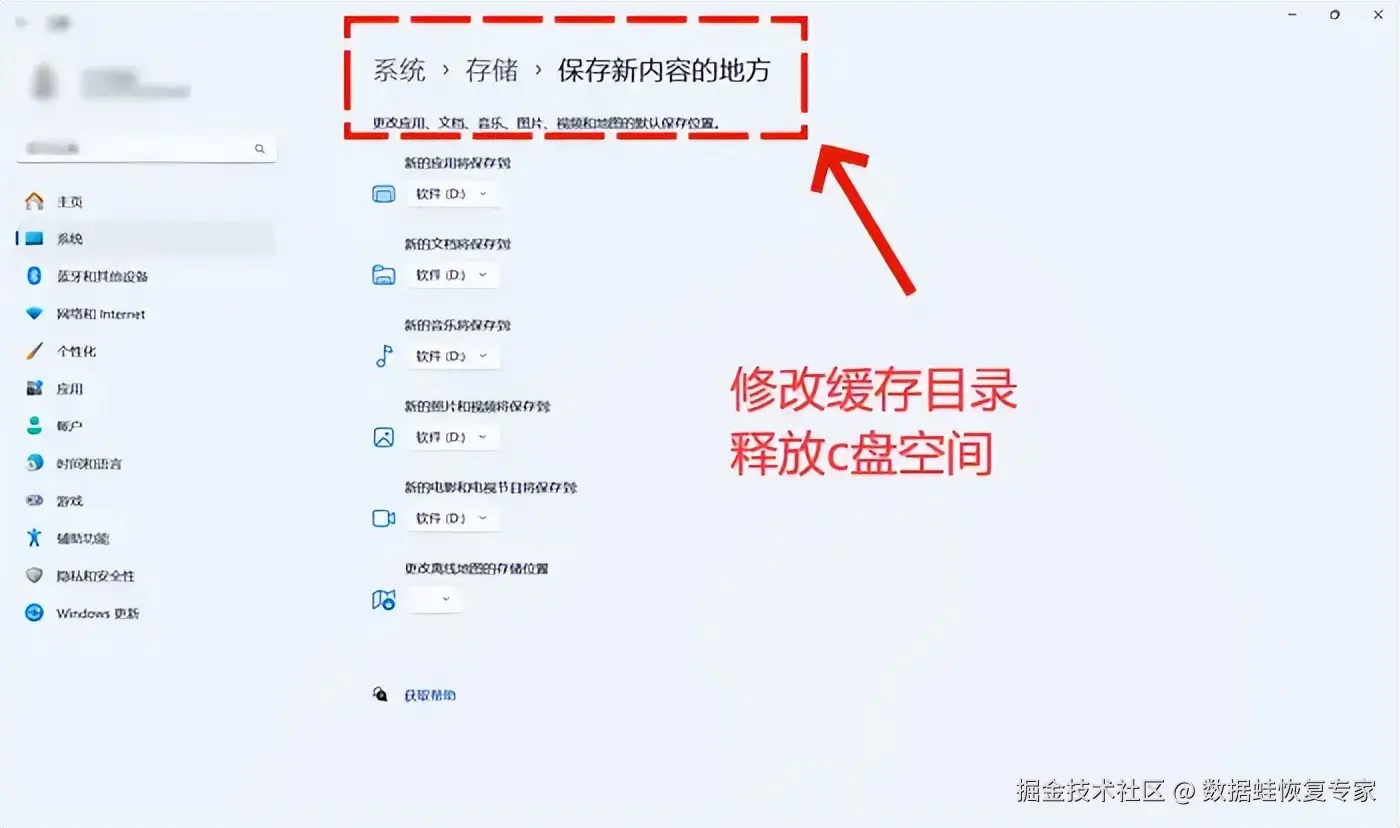 许多程序在运行时会产生缓存文件,这些文件通常保存在C盘的特定目录下。为了释放C盘空间,你可以将这些缓存目录更改为其他磁盘分区。具体做法为 【设置】-【系统】-【存储】-【保存新内容的地方】 。最后,根据需要修改缓存位置即可。