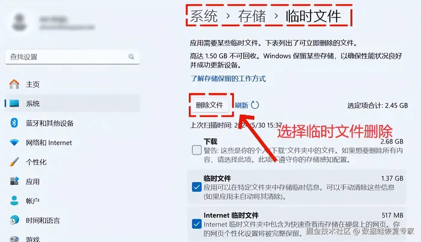 临时文件是电脑在运行过程中产生的一些临时性数据,它们通常用于加速程序的运行速度。然而,这些临时文件在使用完毕后往往不会自动删除,从而长期占用C盘空间。因此,当你的电脑运行缓慢,还可以通过删除临时文件快速清理c盘。你可以进入设置,查找 【系统】-【存储】-【临时文件】 ,然后勾选不需要的数据,点击 【删除文件】 即可。