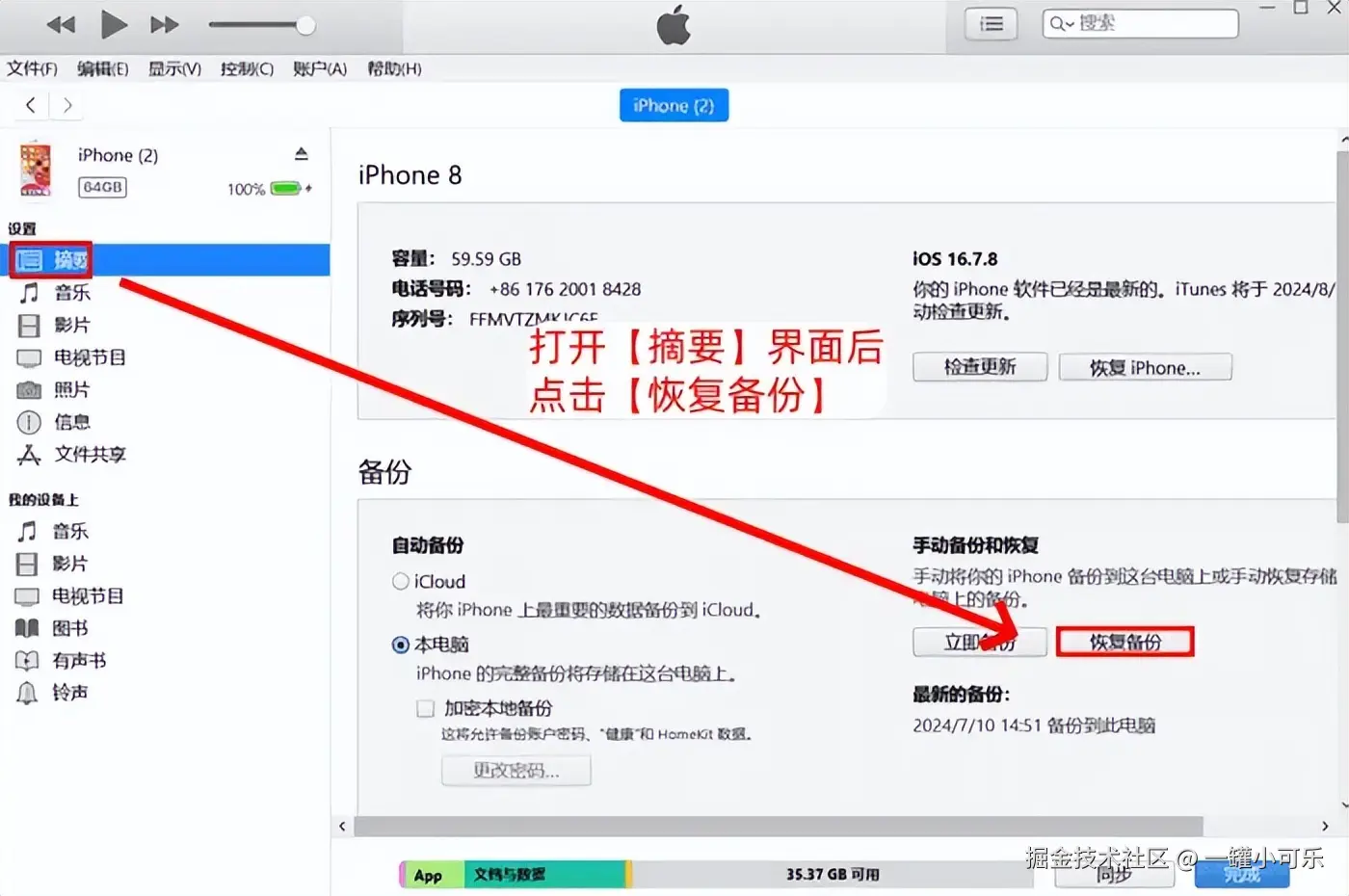 步骤2:在 【摘要】 部分,点击 【恢复备份】 ,等待数据恢复。
