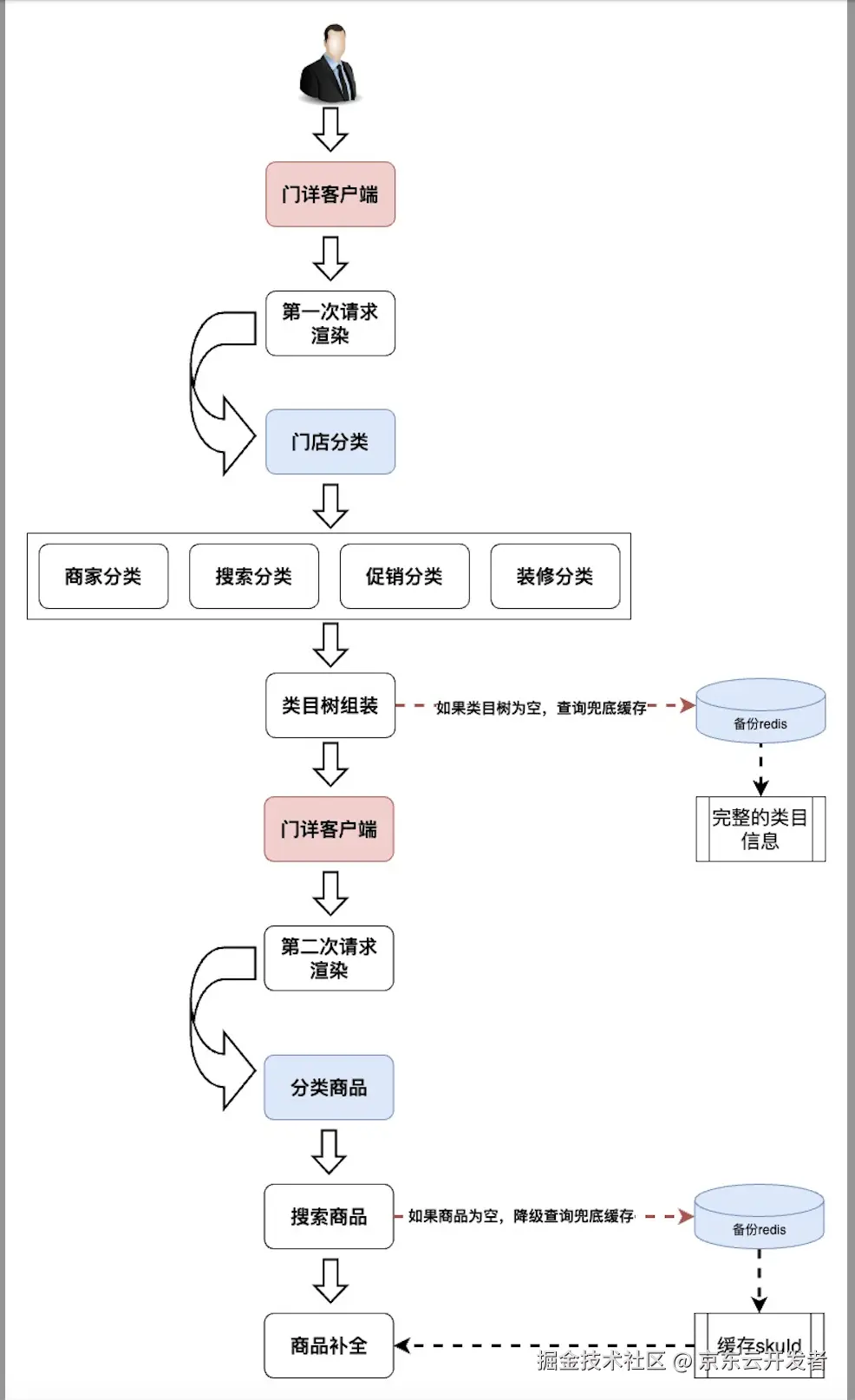 门详的分类和商品加载是二次渲染。在第一阶段调用场景下,客户端会请求类目树,服务端组装好所有的类目树并且返回给客户端。在第二阶段调用场景下,前端会把类目树id传递给服务端,服务端根据分类id去聚合分类下的商品。