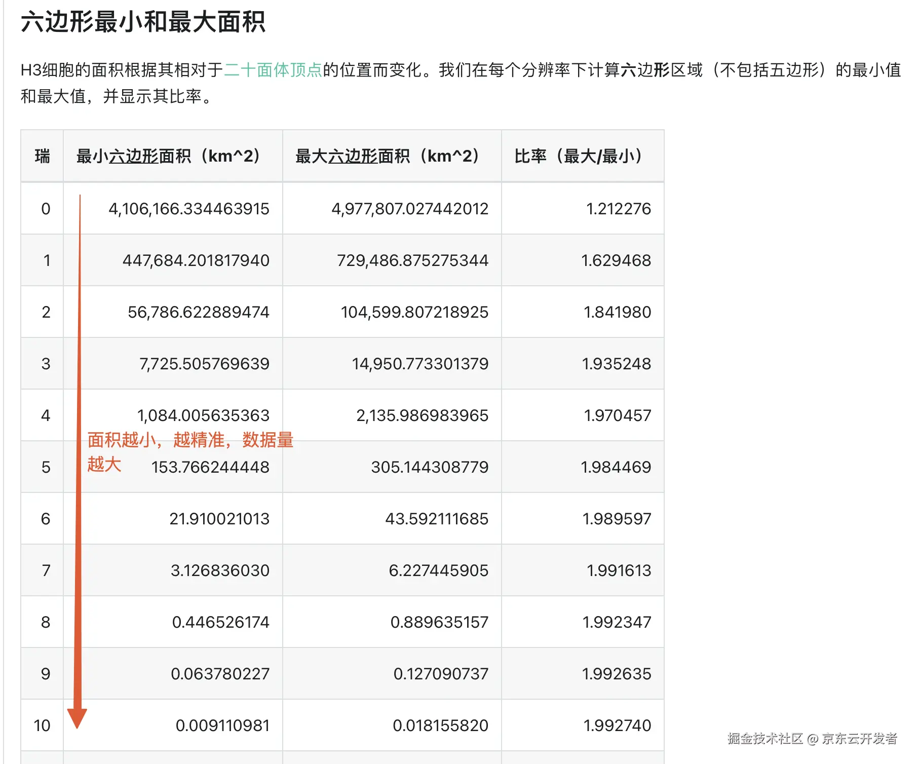 另外一个问题,构建网格的分辨率应该如何选择,也就是我们常说的网格精度。我们去门店中台查了秒送的门店范围,发现90%以上的门店都是基于3公里圈定的不规则履约范围,而这个也是作为GIS判断网格是否覆盖该门店的核心因子。所以在构建网格的时候,每个蜂窝格子的面积限定3公里显然不能得到最优结果,于是我们通过H3的空间索引构建了 Hexagon六边形网格,尽可能的模拟线上真实不规则的履约圈选范围。同时Hexagon的边长精度划定为7也就是1.4km,得到最小六边形面积3.12m²,最大六边形面积6.22m²。同时针对精度8的也异构出一套数据作为diff参照。经过计算后得出(刨去偏远地区),精度7的热点网格数量在几十万+,精度8个网格数量在百万+,和原本的百亿级别相比,降低了99%~~,最后经过成本计算:①精度7的=2973元/月 ;②精度8的=14133元/月 (相比于最初的500万+/月,打折到骨折!)