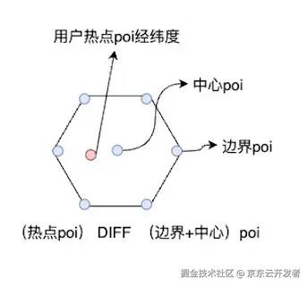 到了验证环节了,因为我们无法完全和GIS的网格重合,那么我们需要一套规则来做DIFF验证网格的热点poi数据备份是否和线上poi数据返回一致 (不可能100%一致,但是需要知道是否达到90%以上的效果),我们选择六边形网格的六个定点poi以及中心poi,共计7个poi去请求线上,并且用返回的数据和热点poi请求返回的数据做DIFF,核心39城每个城市抽查10组,最终得到一个比例。然后通过不同的空间索引精度,去挨个验证出一个最佳的索引精度。