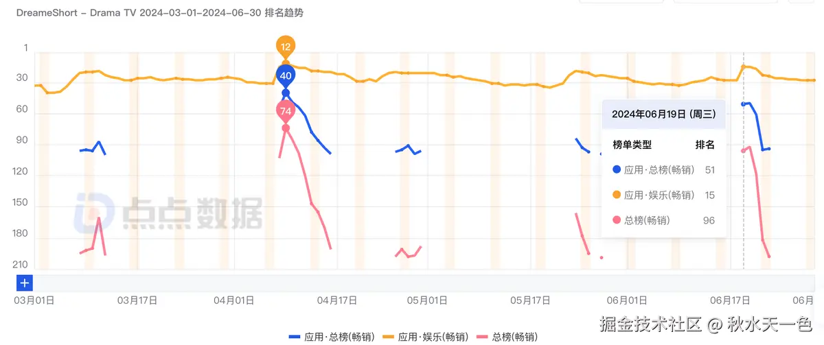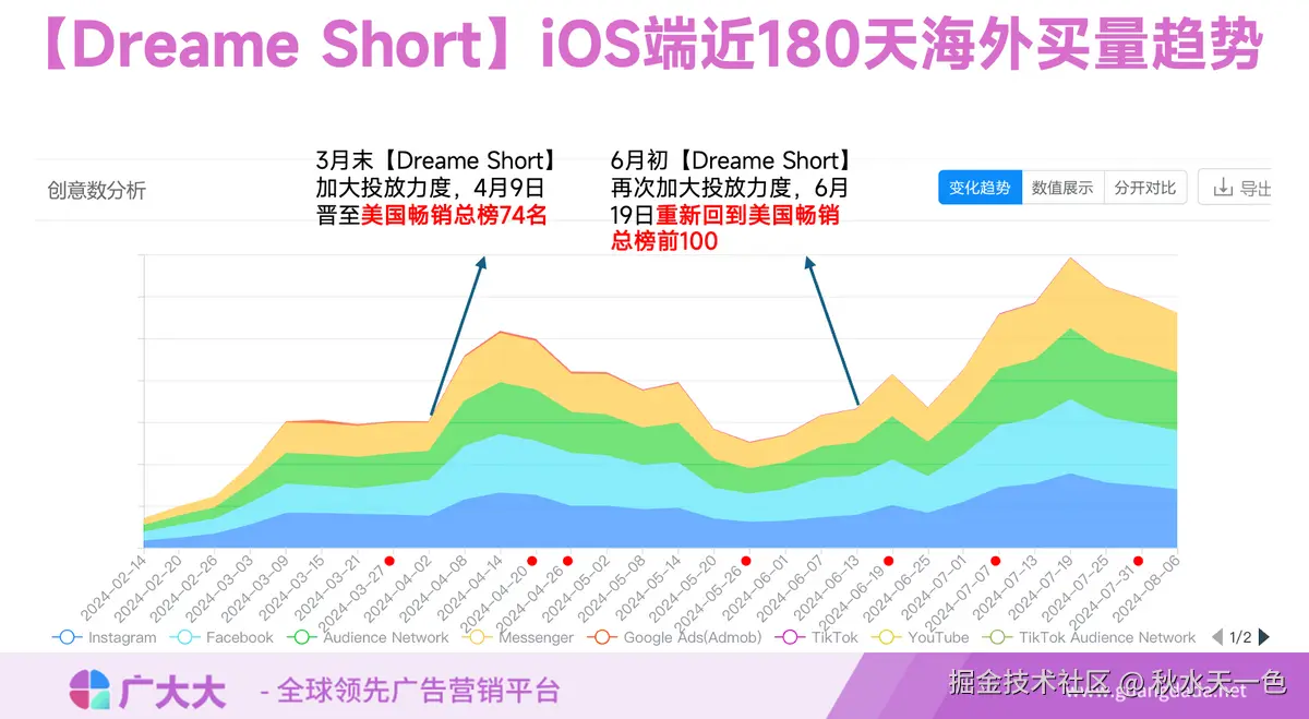 从广大大抓取的【DreameShort】投放数据来看,不难看出【DreameShort】的畅销榜排名的变动与投放数量的变动有着明显关联,短剧的投放能够比较好的转化为实际的应用内购收入,就此而言【DreameShort】的投放性价比还算不错。