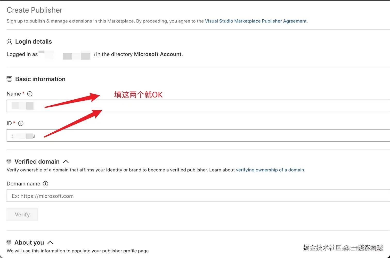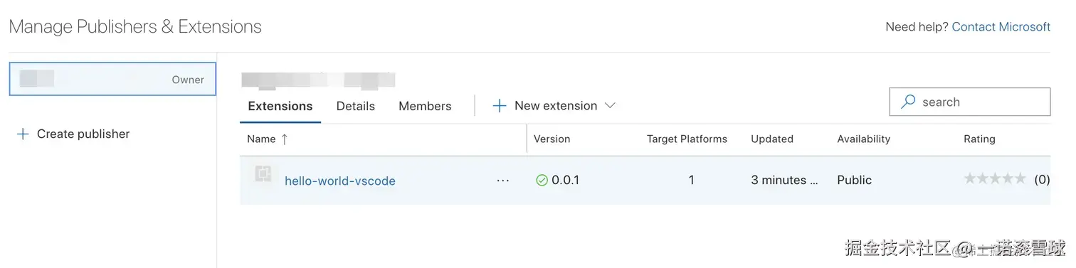 访问创建发布者页面publisher,发布者是发布插件的作者,可以发布多个插件。这个作者名称是vsce login publisherName,注意登录时必须保持一致。