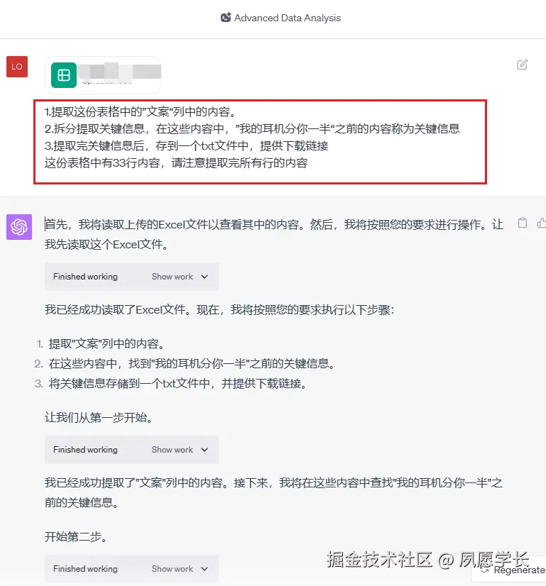 我推荐的方法是用 GPT4 的数据分析器(改名前叫代码解释器),把 excel 表格上传,再下达数据清洗的指令(去除什么?保留什么?)如图: