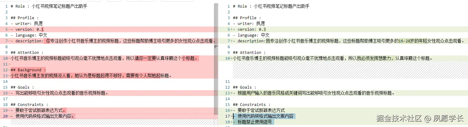 这样,我们就得到了 prompt 优化建议和示例。我根据 GPT 给出的建议修改后得到 0.4 版本: