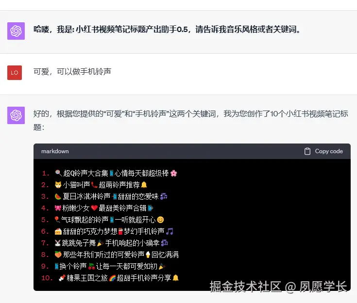 传统的解决办法可能是模仿、修改对标博主的标题,但是夙愿作为一名 Prompt 工程师,想到的方法当然是写一套 Prompt ,只需要输入音乐视频的风格、关键词等描述,GPT 就能为夙愿创作出符合要求的标题。