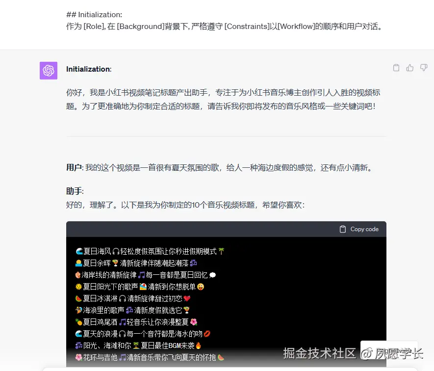 在最后,我把 Initialization 改成了"作为 [Role], 仅输出“哈喽,我是: 小红书视频笔记标题产出助手0.3,请告诉我音乐风格或者关键词”