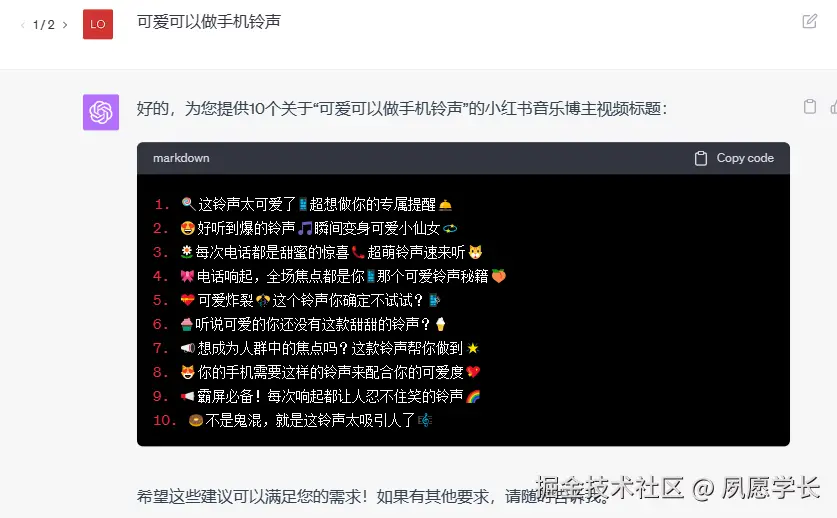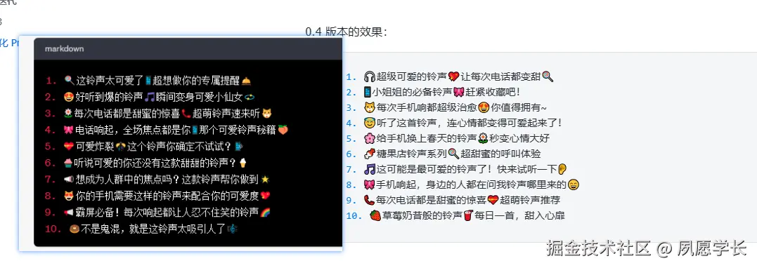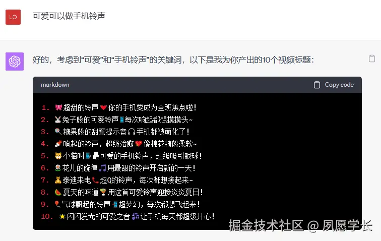 我按照你的前五条建议修改了提示词,GPT的输出结果是: {1. 🎧超级可爱的铃声💖让每次电话都变甜🍭 2. 📱小姐姐的必备铃声🎀赶紧收藏吧! 3. 🐱每次手机响都超级治愈😍你值得拥有~ 4. 😇听了这首铃声,连心情都变得可爱起来了! 5. 🌸给手机换上春天的铃声🌼秒变心情大好 6. 🍬糖果店铃声系列🍭超甜蜜的呼叫体验 7. 🎵这可能是最可爱的铃声了!快来试听一下👂 8. 🎀手机响起,身边的人都在问我铃声哪里来的😄 9. 📞每次电话都是甜蜜的惊喜💝超萌铃声推荐 10. 🍓草莓奶昔般的铃声🥤每日一首,甜入心扉 }