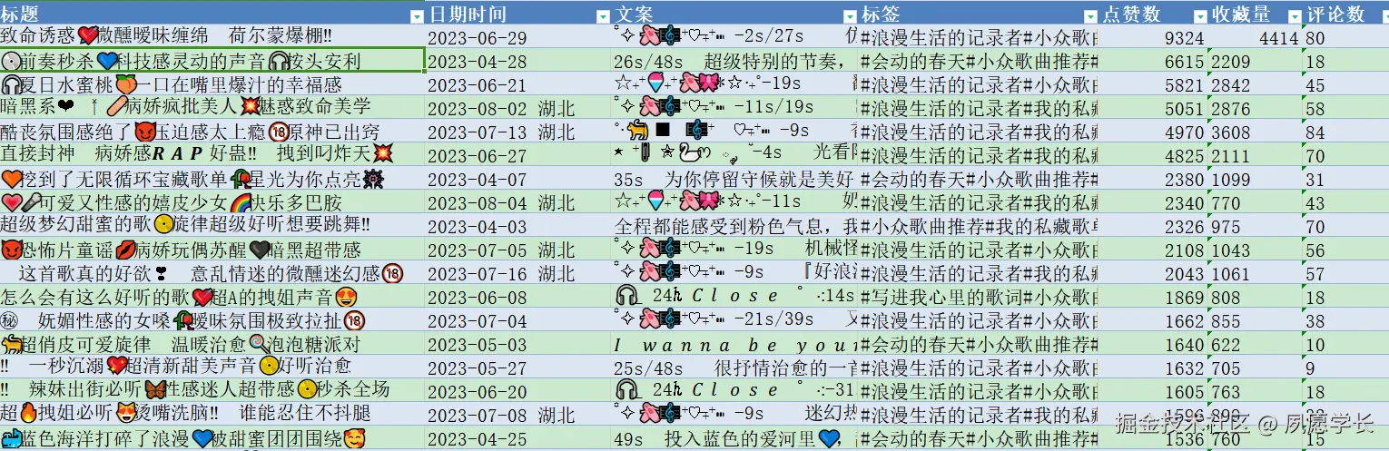总之,采集完毕之后导出一个 excel 表格,一般来说,点赞数高的视频标题写得不错,所以我用 office 打开后,点击筛选,按照“点赞数”降序,这样,点赞数最靠前的标题、文案等内容就展示出来了。