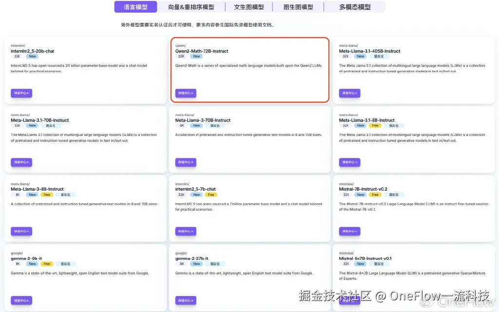 除了Qwen2-Math-72B-Instruct,SiliconCloud已上架包括Qwen2、InternLM2.5-20B-Chat、BCE、BGE、SenseVoice-Small、Llama-3.1、FLUX.1、DeepSeek-V2-Chat、DeepSeek-Coder-V2、SD3 Medium、GLM-4-9B-Chat、InstantID在内的多种开源大语言模型、图片生成模型、代码生成模型、向量与重排序模型以及多模态大模型。