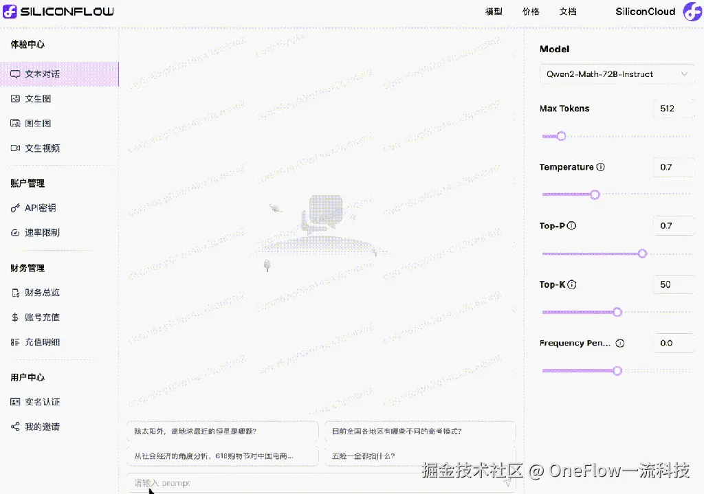 直观感受下Qwen2-Math-72B-Instruct在SiliconCloud上的生成速度与效果。