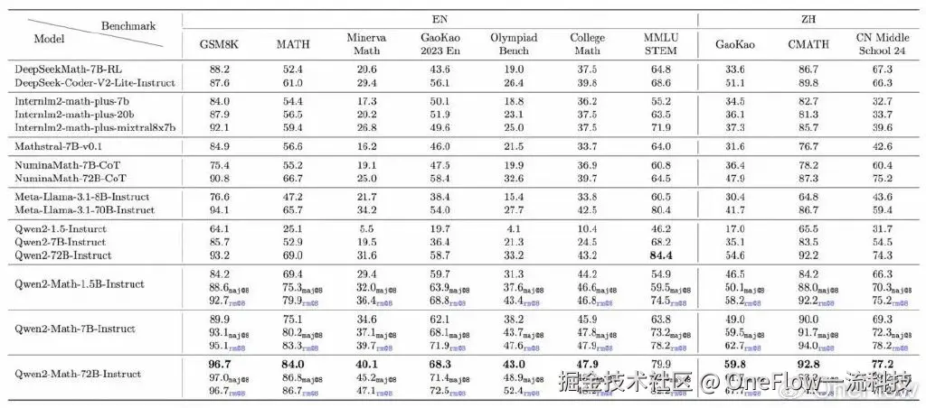 注:通义研发团队在greedy和RM@8 的条件下对模型作了测评,表中为每款Qwen2-Math-72B-Instruct模型列出了三个得分结果,分别是第1次回答得分(无下标数字)、8次回答中出现最多次数的答案的得分,8次回答中reward model所选答案的得分。