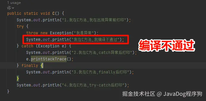 System.out.println("1.我在C方法,我在出现异常前打印");