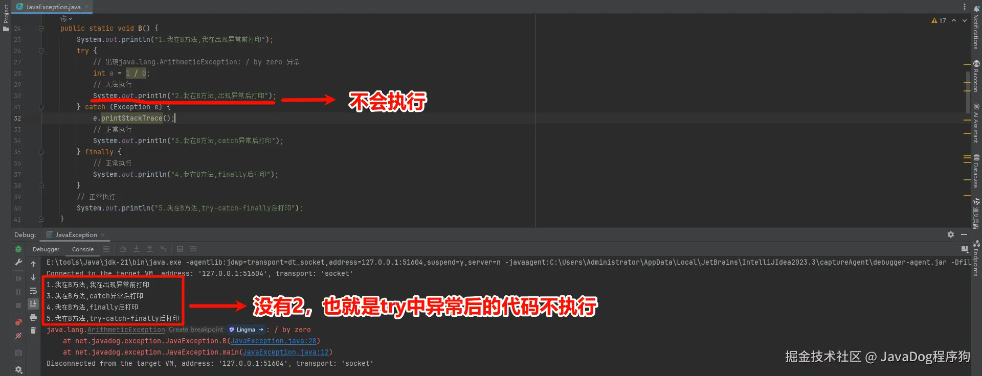 方法B,使用try-catch捕获,出现异常后,try中后续代码不会执行,但后续代码不影响