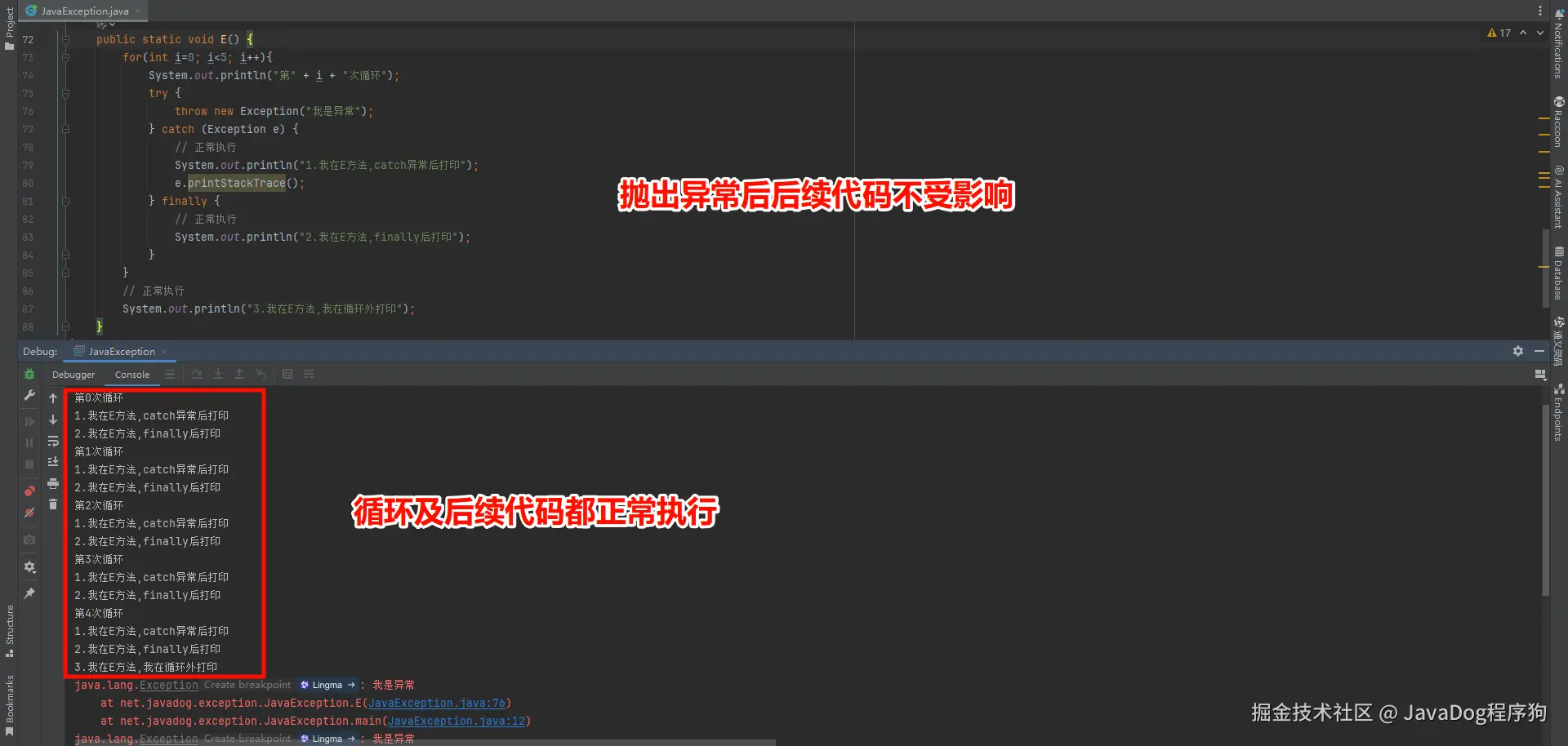 5.在循环中,使用try-catch捕获,throw异常后代码不受影响