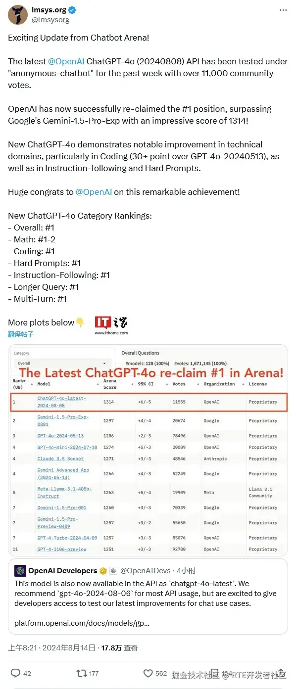 谷歌的实验性 Gemini 1.5 Pro 模型上周以 1297 分的成绩夺得第一名,这是谷歌首次登顶 LMSYS 的聊天机器人竞技场。本周 OpenAI 凭借新的 chatgpt-4o-latest 模型,以 1314 分的最高分夺回了竞技场第一名的宝座。得分显示,新版 ChatGPT-4o 在编码、指令遵循和硬提示方面都有显著提高。(@IT 之家)