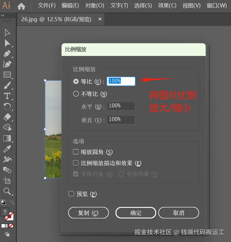 - 点击 对象 -> 变换 -> 缩放 (将图片进行放大/缩小)