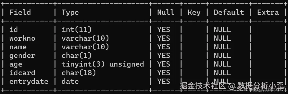 - 查询表结构:DESC表名;