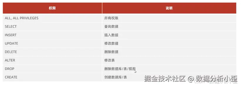 MySQL中定义了很多的权限,但是常用的就是以下几种: