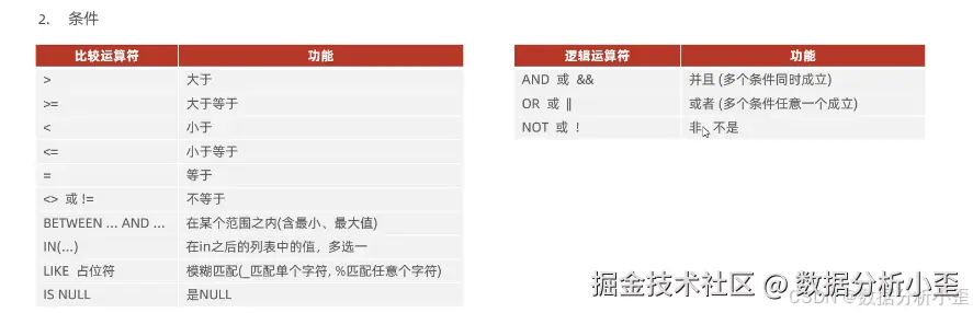 - DELETE语句的条件可以有,也可以没有,如果没有条件,则会删除整张表的所有数据。