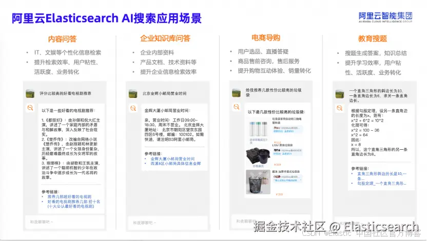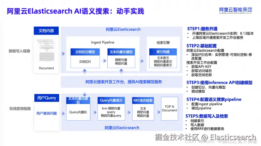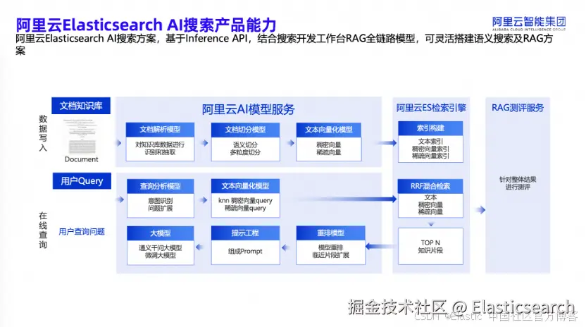 阿里云 AI 搜索的方案,基于阿里云 Elasticsearch Inference API,可以结合阿里云自研的 AI 模型服务,灵活的搭建语义搜索或者是 RAG 链路。AI 搜索可以基于 ES 语法进行灵活的编排,易用性更高,后面的实操环节大家可以具体体验下。