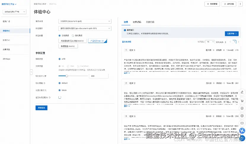 接下来看下切片服务,这里指定切片最大长度为 300,模型会在保证语义完整性的同时,按照最大 300 的长度来切分。可以看到右侧的结果,每一个切片的语义都相对比较完整,这也是为了在我们后续检索时,达到更好的效果。切片完的信息,会返回一个树状的结构,方便在后续召回时进行上下文的补全,给大模型更加完整准确的信息,也有助于提升最终大模型回答的效果。