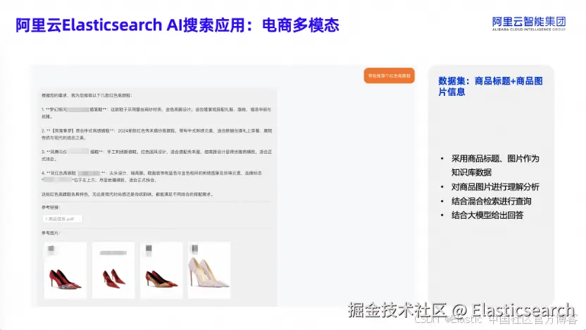 接下来,这是一个电商多模态的问答场景,数据采用商品的标题和图片信息。这里会对商品的图片进行识别解析,结合标题信息,生成索引。因此,让系统推荐一个红色的高跟鞋时,这里可以给出几款不同品牌的商品推荐,以及理由,下面还可以给出对应的商品图片信息。在我们实际电商导购的场景中,可以把商品信息、图片信息,以及更多的信息都容纳进来,可以更进一步的理解,给出最终的答案,整体的丰富度也会更好一些。