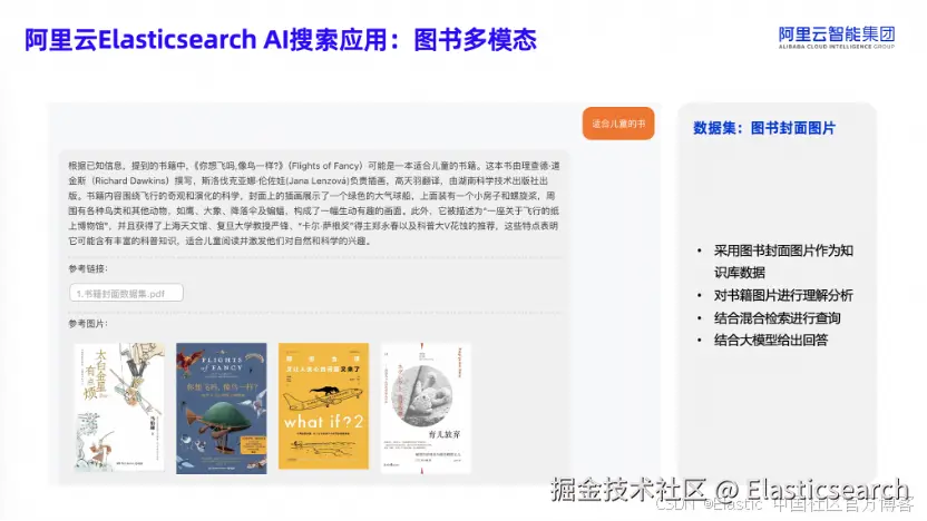 接下来我们看几个多模态的场景,这也是我们后续即将发布的能力。这里是一个图书多模态问答场景,采用的数据是图书的封面图片。问题是:适合儿童的书?在这里可以看到,首先给出的是一段文本的回答内容,推荐了对应的儿童书籍。同时,还有对应的参考链接。最下面显示了相关的参考图片。在这个 case 中,由于底层数据是纯图片的,因此需要先对图片内容进行解析理解,抽取出对应的文本描述,生成索引。当用户提出问题时,会在已经解析好的文本内容中进行检索,然后给出对应的答案。
