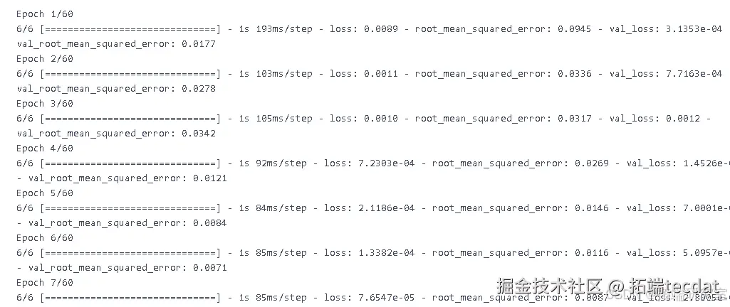 hist = lstm.fit(X_train, y_train,batch_s)此语句执行了 LSTM 模型的拟合过程。在这个过程中,模型学习输入数据X_train和对应的目标数据y_train之间的关系,并通过调整模型的参数来最小化预测误差,以达到良好的拟合效果。