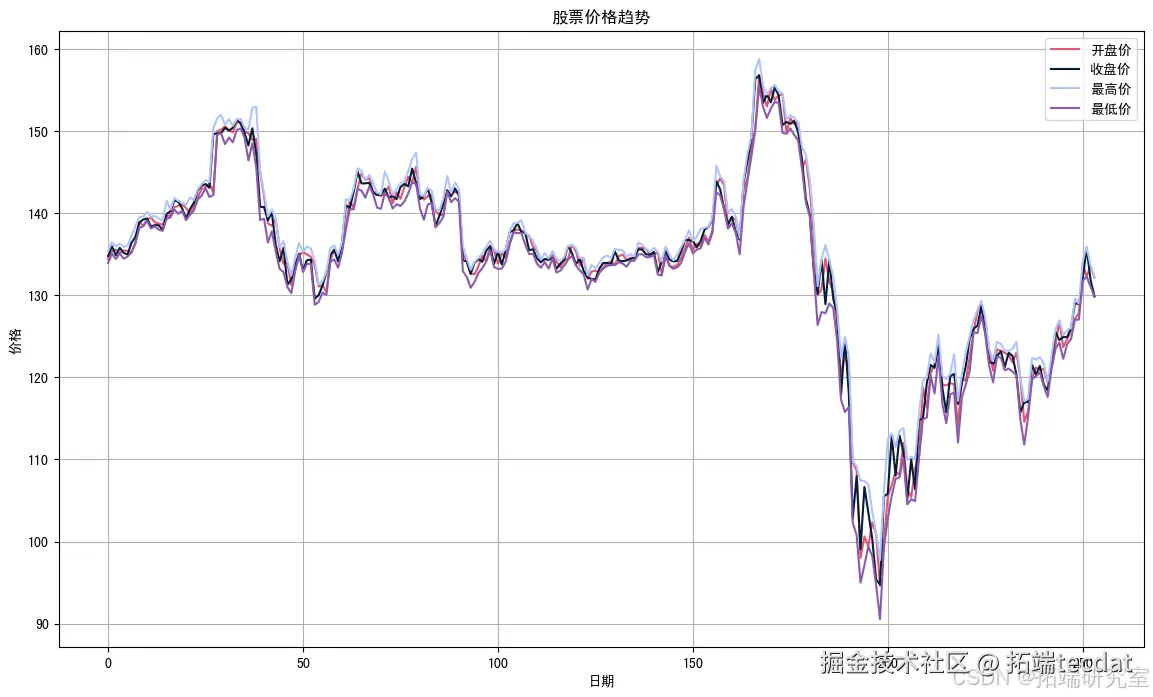 - 股票的开盘价、收盘价、最高价和最低价的趋势图。
