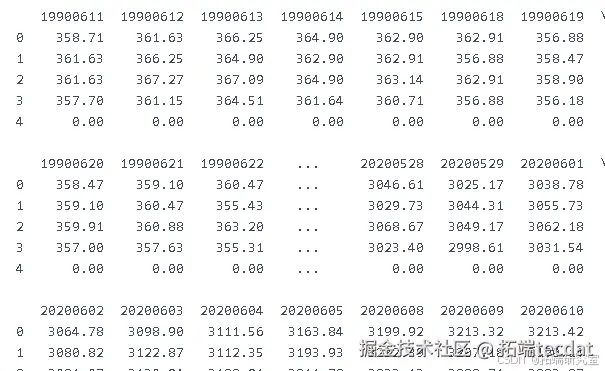 在此我们可以看到,我们有 254 列,对应着我们拥有金融数据的 254 个工作日,还有 10 列,它们是我们所拥有的 10 个金融指标。