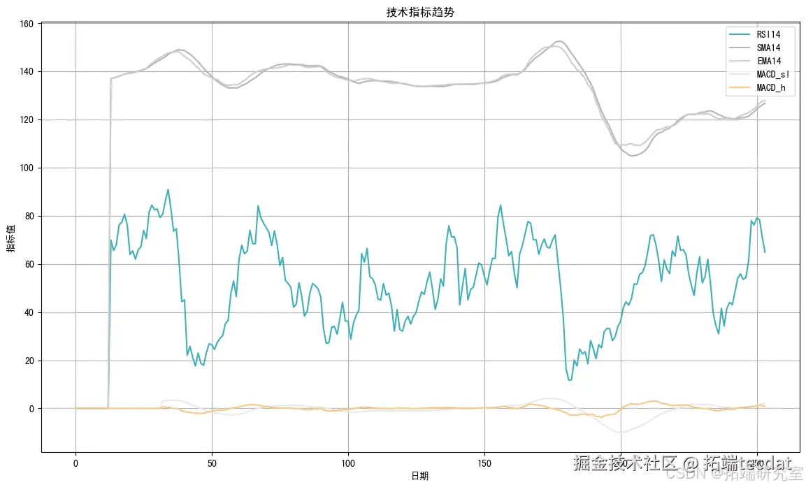 - 技术指标(RSI14、SMA14、EMA14、MACD_sl、MACD_h)的趋势图。
