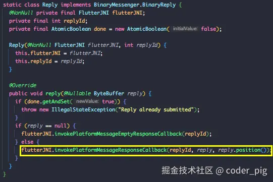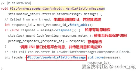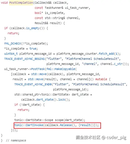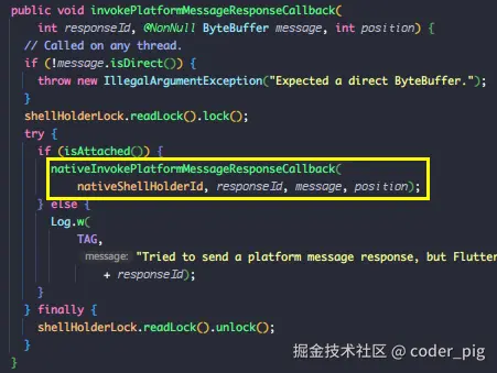 直接在 flutter/engine 仓库搜 InvokePlatformMessageResponseCallback,路径:shell/platform/android/platform_view_android_jni_impl.cc:
