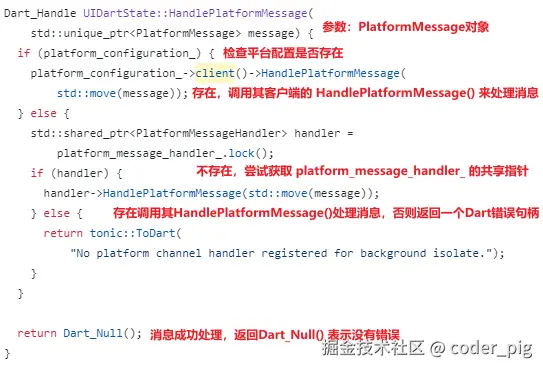 调的 UIDartState 对象的 HandlePlatformMessage(),跟一下 lib/ui/ui_dart_state.cc: