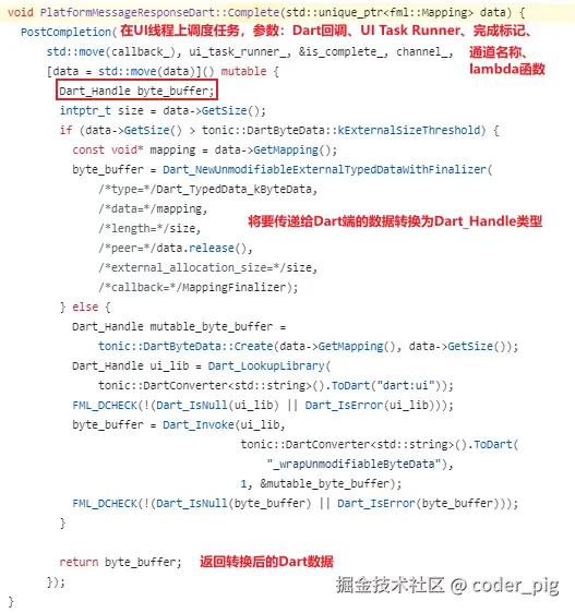 由注释得知 message_response 的类型为 PlatformMessageResponseDart,跟下 Complete() ,路径:lib/ui/window/platform_message_response_dart.cc: