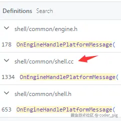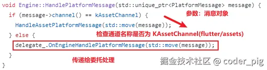 这个 delegate_ 是 Engine 类的一个成员变量,用于引用 Engine::Delegate 的接口实现,它在构造函数中完成初始化,搜下 OnEngineHandlePlatformMessage() ,很明显就是这个 shell/common/shell.cc: